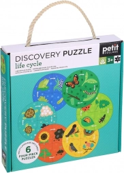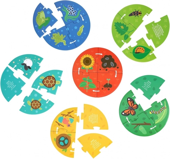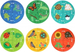 Puzzle Odkrywcy Cykl życia pomagają wzbudzać zainteresowanie światem przyrody. Zestaw zawiera sześć małych puzzli, które ilustrują etapy życia biedronki, motyla, żółwia, żaby, kwiatu i ptaka. Produkt przyczynia się do rozwoju koordynacji ręka-oko, rozwoju poznawczego i umiejętności rozwiązywania problemów.