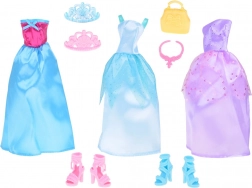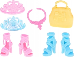 Dwie eleganckie pary butów na obcasie dodają uroku i stylu całemu wyglądowi. Akcesoria, takie jak efektowna torebka, różowy naszyjnik i dwie korony są idealne dla każdej małej księżniczki.