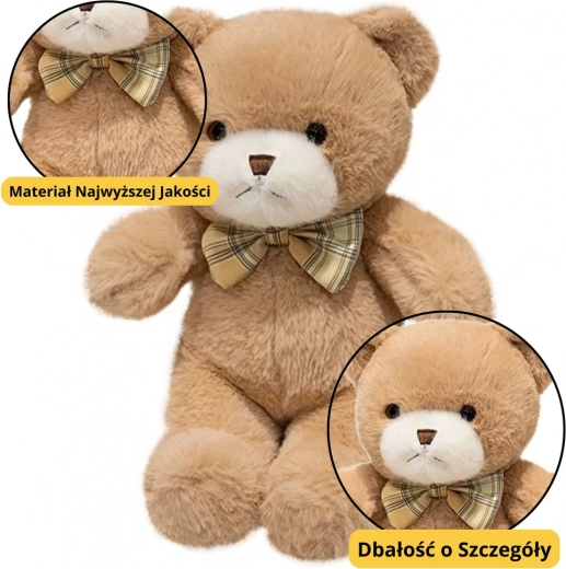 Pluszowy miś ma na sobie elegancką, kraciastą muszkę, która dodaje mu wyjątkowego uroku. Dzięki stabilnej konstrukcji i proporcjonalnej sylwetce miś potrafi samodzielnie siedzieć, co czyni go świetnym elementem dekoracyjnym do pokoju dziecięcego. To idealny towarzysz codziennych zabaw oraz perfekcyjny prezent dla każdego, kto ceni klasyczne, urocze pluszowe zabawki.