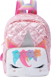 Model wykonany jest z lekkiego, a jednocześnie wytrzymałego materiału, odpornego na zabrudzenia i uszkodzenia. Przód zdobi filcowa aplikacja jednorożca, kwiaty z uszami oraz lśniący róg. Plecak ma przestronną komorę główną, mniejszą wewnętrzną kieszeń oraz zewnętrzną kieszeń na zamek dla łatwego uporządkowania rzeczy. Regulowane szelki zapewniają wygodę i dopasowanie do wzrostu dziecka.