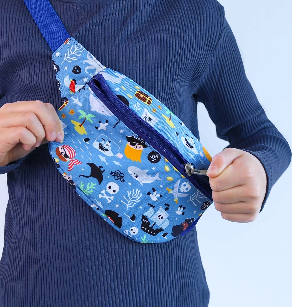 Idealna dziecięca nerka dla małych piratów z regulowanym paskiem. Doskonale nadaje się do noszenia w pasie lub jako torebka typu crossbody. Z łatwością pomieści portfel, telefon komórkowy i drobne wartościowe przedmioty.