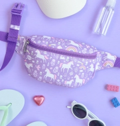 Dziecięca jasno fioletowa nerka z motywem jednorożców i tęczy to praktyczny dodatek dla Twojego dziecka. Dzięki regulowanemu paskowi można ją nosić w pasie lub jako torebkę crossbody.