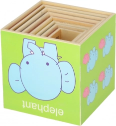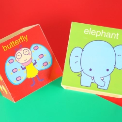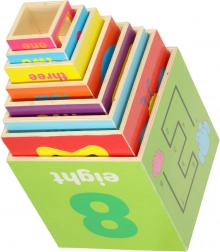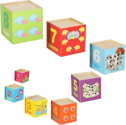 Dziecko nauczy się liczb, liczenia, podstawowych angielskich słówek oraz rozpoznawania popularnych zwierząt z farmy. Jedna strona klocka przedstawia liczbę i jej angielską nazwę, kolejna – odpowiadającą jej liczbę zwierzątek. Następna strona zawiera obrazek zwierzęcia z angielskim podpisem. Nie brakuje też otworów do dopasowywania kształtów, co świetnie ćwiczy precyzję i koordynację ręka–oko.