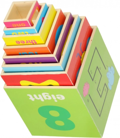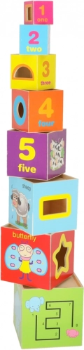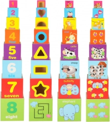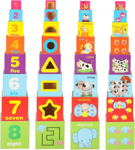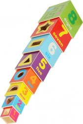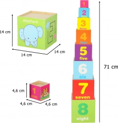 Zestaw zawiera 8 kolorowych drewnianych klocków, które można układać jeden na drugim, tworząc wieżę o wysokości aż 71 cm! Każdy klocek ma 8 aktywnych edukacyjnych stron, oferujących różne możliwości zabawy i nauki.