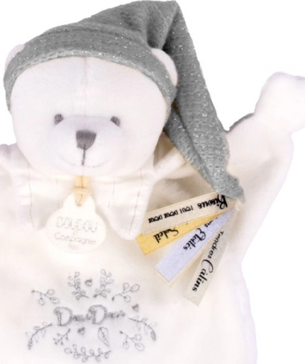 Pluszowy miś marki Doudou to idealny prezent dla noworodka. Miś ma urocza szarą czapeczkę i miękkie białe łapki, które przypominają małe buciki.