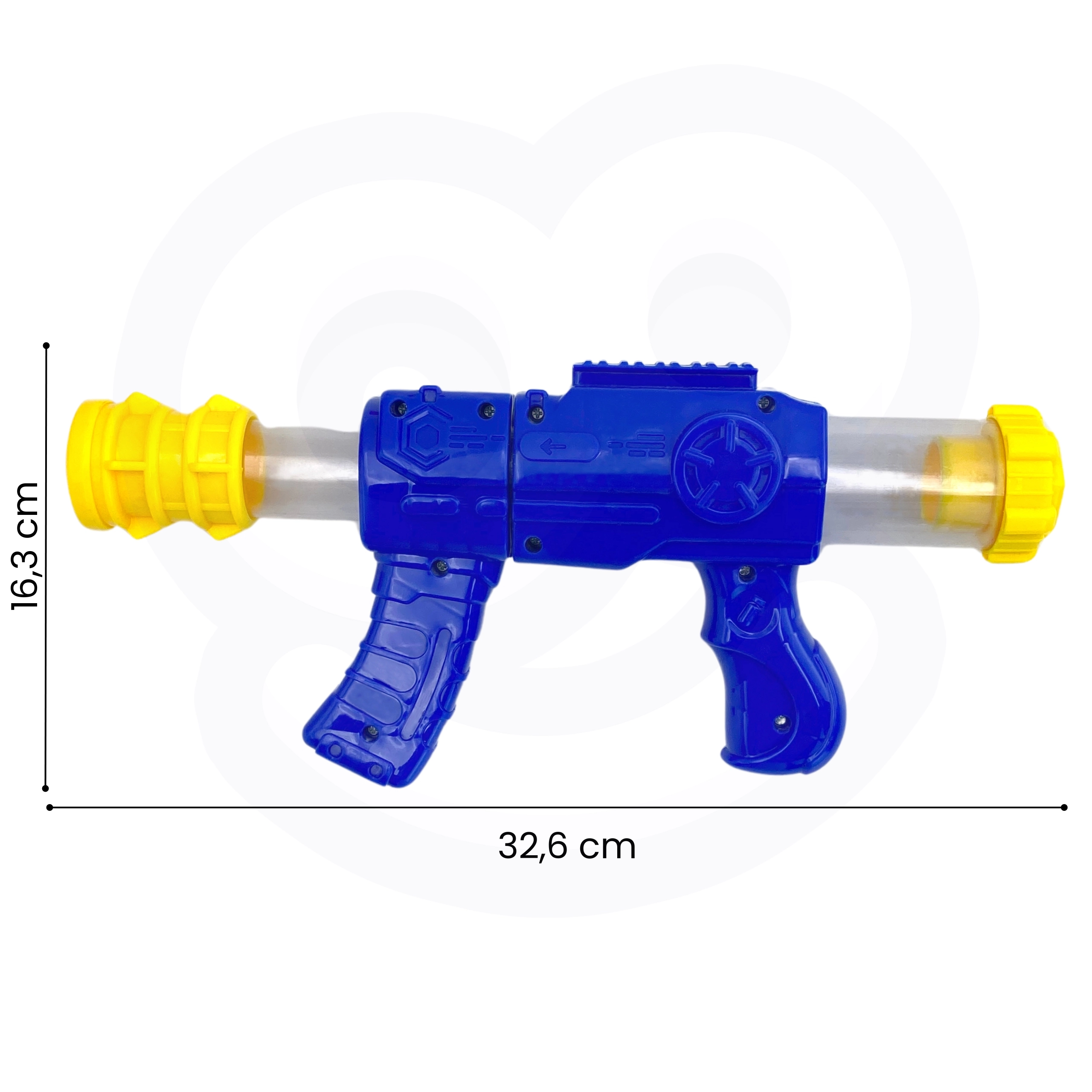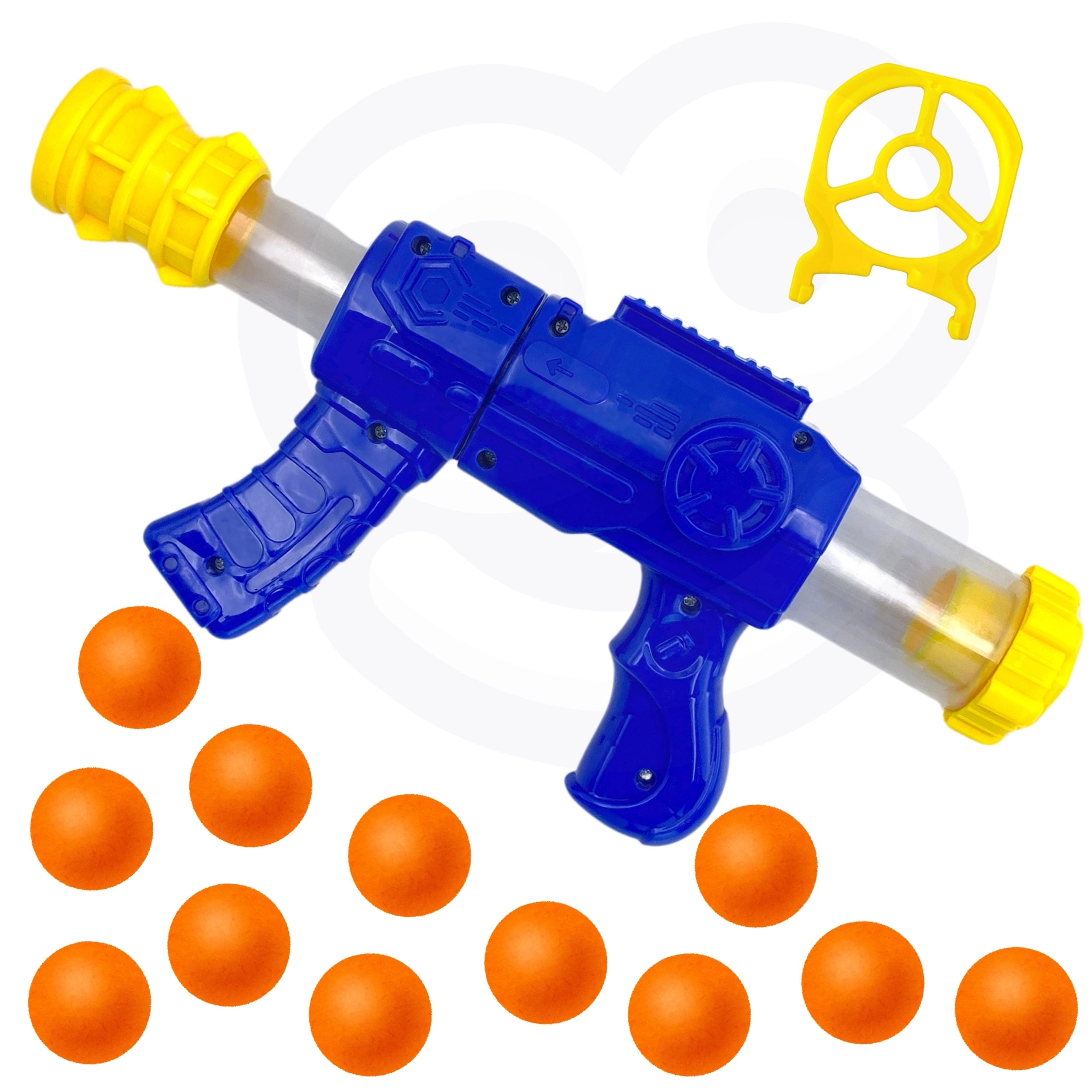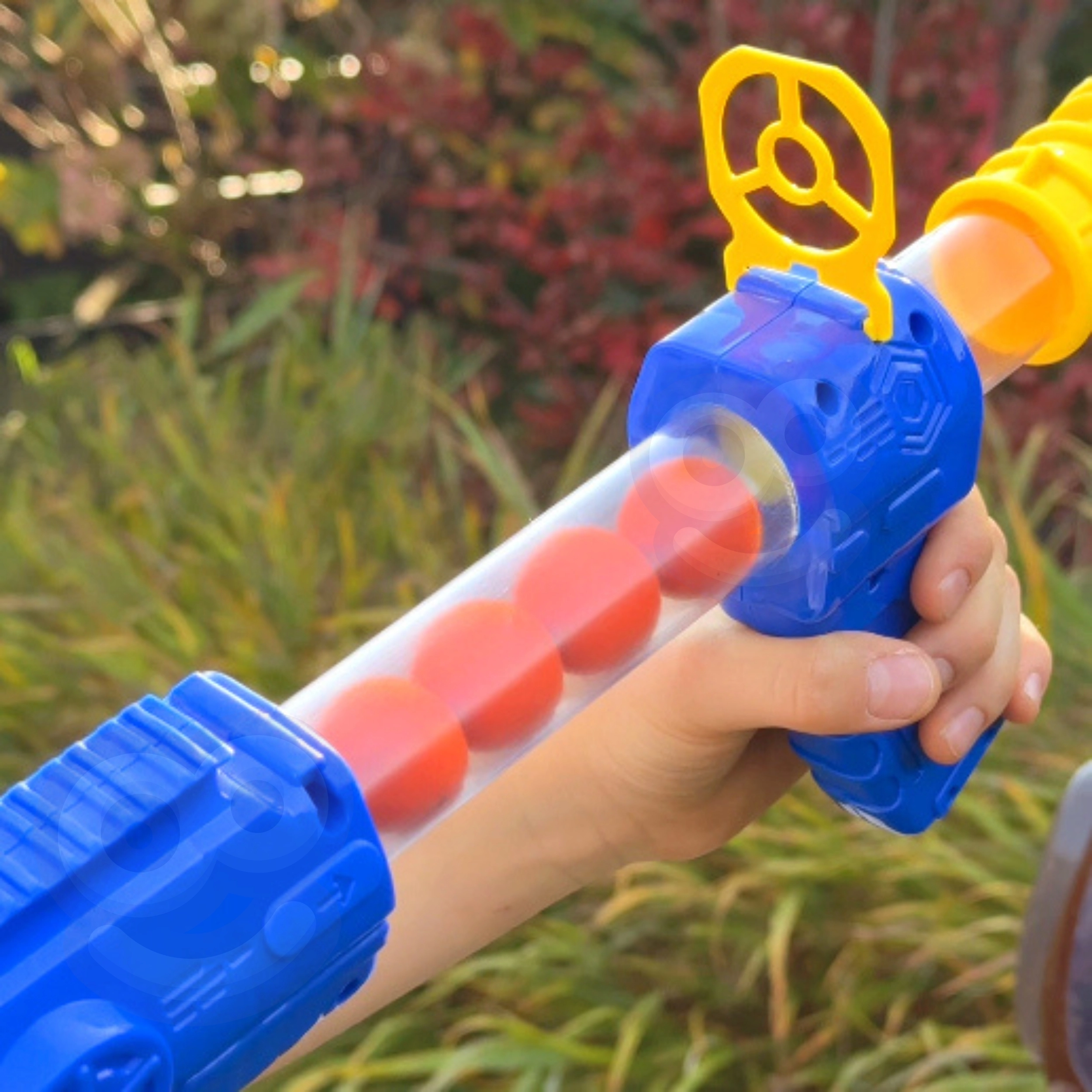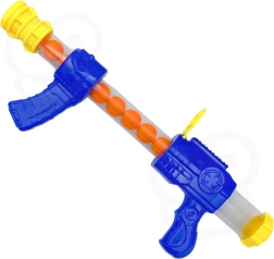 - - Pistolet jest napędzany powietrzem, wystarczy przesunąć kolbę do siebie, a piłeczka zostanie wystrzelona