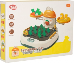 Specjalnie zaprojektowana plansza z otworami pozwala dzieciom ćwiczyć precyzję ruchów – wkładanie i wyciąganie marchewek pomaga rozwijać umiejętności motoryczne i wprowadza element zdrowej rywalizacji w formie gry „kto szybciej zbierze”.