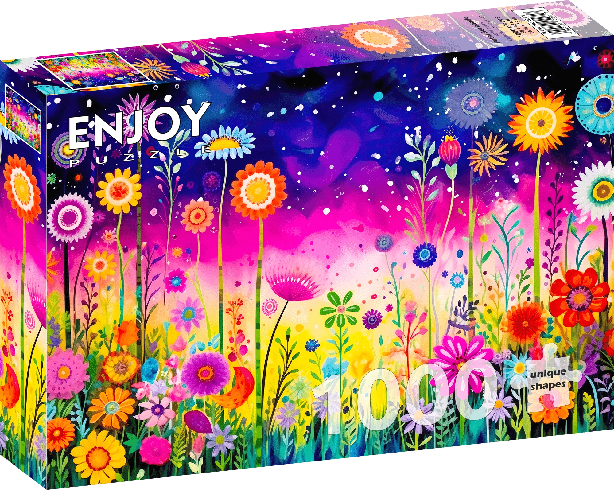 Delektuj się wyjątkowym doświadczeniem układania puzzli Serenada Płatków Kwiatów, które zawierają 1000 elementów i zachwycają pięknym wzorem kwiecistego pejzażu.