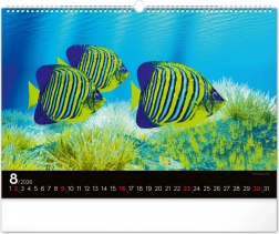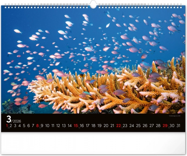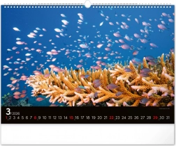 Marcowa karta kalendarza zachwyca energią dzięki scenerii pełnej małych rybek wśród raf koralowych. Niebieskie oceaniczne tło dodaje obrazowi dynamiki i świeżości.