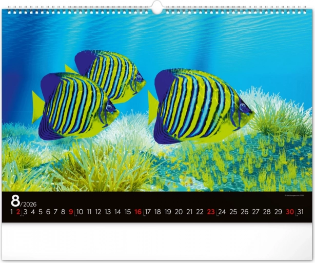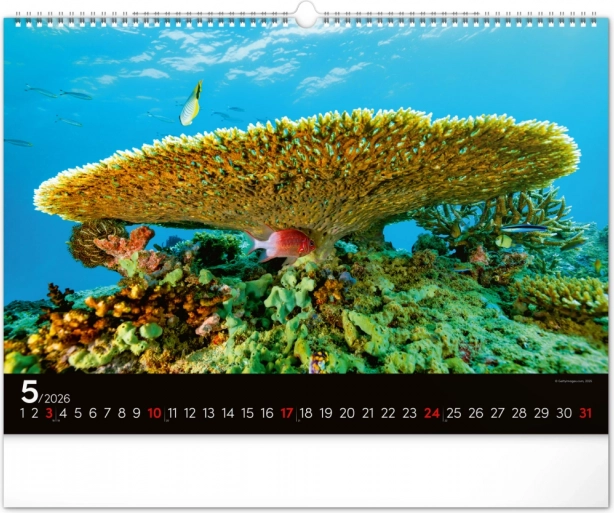 Maj przynosi obraz koralowego raju z kolorowymi rybami, które nadają kalendarzowi jasne i żywe barwy. Ten miesiąc emanuje optymizmem i pięknem.