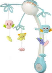 Karuzela do łóżeczka wyposażona jest w kolorowe gwiazdki oraz zawieszane zabawki w kształcie ptaszków i misiów, które zachęcają dziecko do wyciągania rączek i chwytania wiszących elementów. Wspierają tym samym rozwój zmysłów i wzmacniają mięśnie. Boczne elementy wykonane są z miękkiej, nietoksycznej gumy, która może służyć jako gryzak.