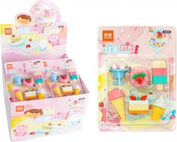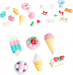W tym atrakcyjnym zestawie znajdziesz gumki przypominające lody, ciasteczka, desery i muffiny – każda z nich jest starannie dopracowana i zachwyca żywymi kolorami.
