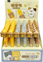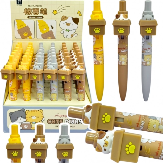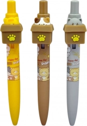 Długopis ma wygodny uchwyt, dobrze leży w dłoni i pisze płynnie, dzięki czemu codzienne użytkowanie to przyjemność. Największą atrakcją jest mechanizm klikający – naciśnięcie górnej części długopisu nie tylko wysuwa wkład, ale także „wyskakuje” kot z pudełka. To zabawne i funkcjonalne rozwiązanie sprawia, że każde pisanie staje się przyjemnością. Ciekawe wzory i pastelowe kolory czynią z niego świetny prezent lub element szkolnej wyprawki.