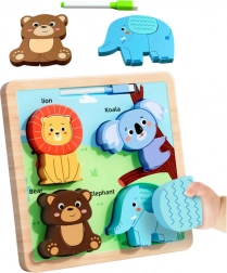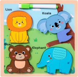 Drewniana edukacyjna układanka z motywem dzikich zwierząt to uniwersalna zabawka, która rozwija manualne i poznawcze umiejętności dziecka. Ta układanka zawiera cztery kolorowe postacie dzikich zwierząt: lwa, koalę, niedźwiedzia i słonia, które można dopasować do właściwych miejsc.