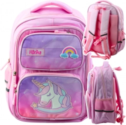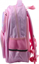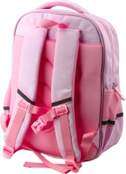 Plecak szkolny ma dwie przestronne komory, z których główna posiada przegrodę ułatwiającą organizację książek i zeszytów. Z przodu znajdują się dwie kieszenie na zamek, do których zmieści się piórnik, przekąska lub inne drobiazgi. Po bokach umieszczono elastyczne kieszenie na butelkę lub bidon.