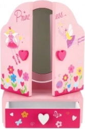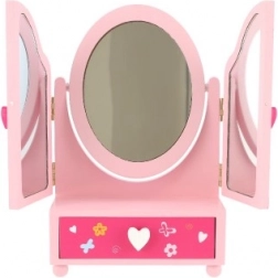 Drewniana toaletka ze szkatułką Princess to świetny dodatek do dziecięcego pokoju. Centralne owalne lusterko uzupełniają dwa boczne skrzydła dla wygodnej regulacji kąta. W dolnej części znajduje się praktyczna szufladka, do której dzieci schowają swoje małe skarby. Delikatne zdobienia z motywami wróżek, kwiatów i serduszek pobudzają wyobraźnię i radość z zabawy.