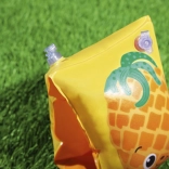 Jaskrawe kolory i figlarne nadruki z owocami i zwierzątkami zwiększają widoczność dziecka w wodzie.