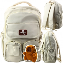 Wygląd plecaka jest uzupełniony ozdobnymi przypinkami z motywem kapibary i pluszowym brelokiem w kształcie kapibary, który dziecko może przymocować według własnego uznania i personalizować wygląd swojego plecaka.