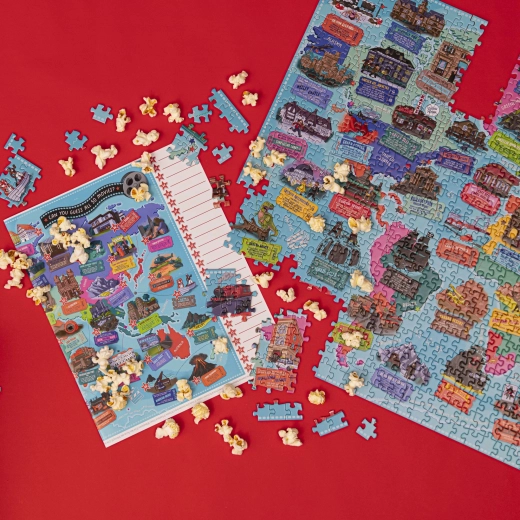 Przetestuj swoją filmową wiedzę dzięki tej zabawnej układance z 1000 elementów, przedstawiającej kultowe filmowe miejsca! Sprawdź, czy potrafisz rozpoznać, z jakich filmów pochodzą poszczególne sceny.