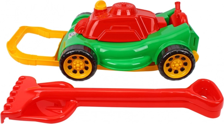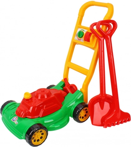 Ta kolorowa plastikowa kosiarka z akcesoriami to świetna zabawka na pierwsze ogrodnicze próby. Dzieci mogą pchać kosiarkę, kręcić pokrętłami i naśladować pracę dorosłych, co rozwija ich motorykę i wyobraźnię. Lekka konstrukcja i zaokrąglone krawędzie zapewniają bezpieczną zabawę dla najmłodszych.