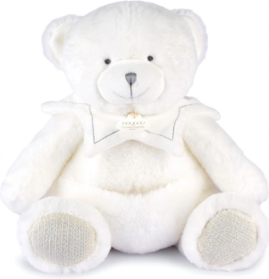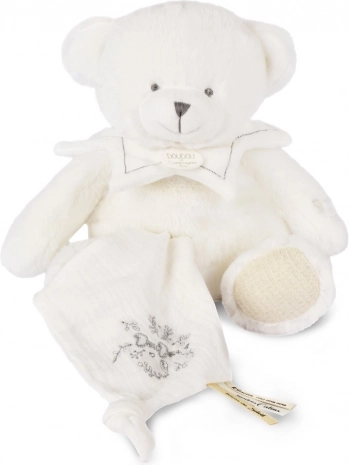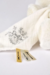 Miś jest wyposażony w kocyk, który można łatwo schować do jego brzuszka, co jest bardzo praktyczne podczas podróżowania lub przechowywania. Doudou zdobi delikatny haft oraz atłasowe wstążki z francuskimi napisami, które dodają subtelności każdemu przytuleniu.