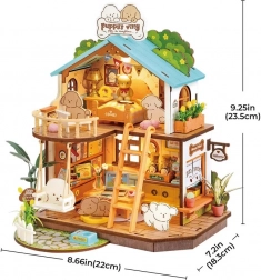 Odkryj magię tworzenia z domkiem, który zawiera przestronną sypialnię, przytulny salon z huśtawką i jadalnią oraz na pierwszym piętrze balkon. Każdy detal jest precyzyjnie wycięty, w zestawie znajduje się miękka pościel, stolik nocny z lampką, laptop, biblioteczka, automat do cappuccino i kwiaty. Dzięki oświetleniu LED na parterze i pierwszym piętrze Twój pupil czuje się przyjemnie.