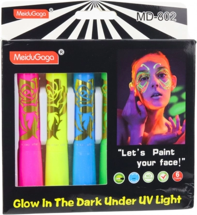 Neonowy zestaw do malowania twarzy to idealny sposób na rozwijanie kreatywności, wyobraźni i wyrażania siebie przez sztukę. Sześć wyrazistych fluorescencyjnych kolorów ożywi każdą imprezę lub festiwal.