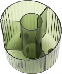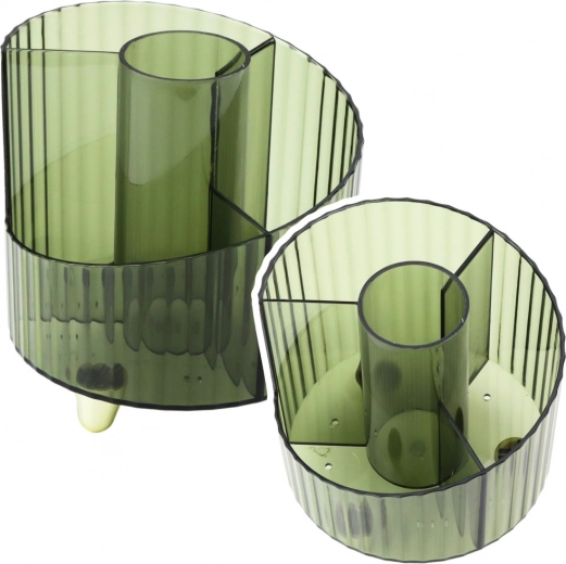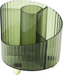 Organizer jest wyposażony w kilka przegródek o różnych rozmiarach, co umożliwia łatwe i intuicyjne sortowanie różnorodnych przyborów - od ołówków i długopisów, poprzez zakreślacze i linijki, aż po drobne akcesoria, takie jak gumki, spinacze czy nożyczki. Dzięki swoim kompaktowym wymiarom mieści się nawet na małym biurku, nie zajmując cennego miejsca, a jednocześnie pomaga utrzymać porządek oraz łatwy dostęp do wszystkich potrzebnych narzędzi.