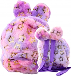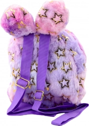 Plecak wykonany jest z miękkiego pluszu, w który wkomponowano błyszczące, złote gwiazdki. Wystające u góry uszka dodają bajkowego uroku, a cała pastelowa kolorystyka jest przyjazna dla dzieci. Plecak ma jedną główną kieszeń na zamek oraz mniejszą przednią kieszonkę, idealną na drobiazgi.