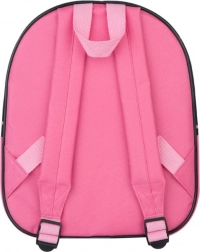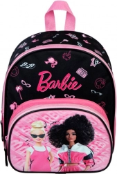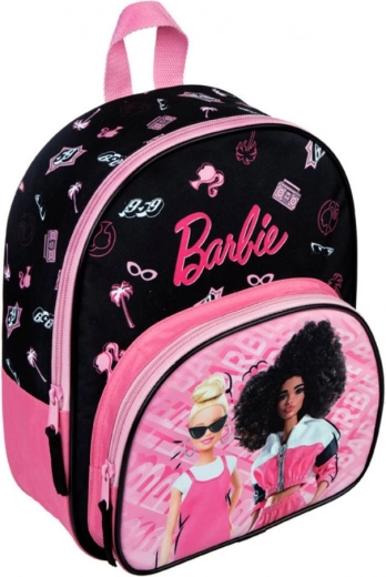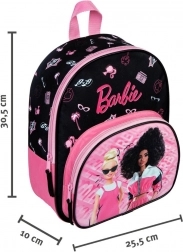 Plecak z motywem Barbie oferuje atrakcyjny wygląd w różowo-czarnej kolorystyce z obrazkami ulubionej lalki.