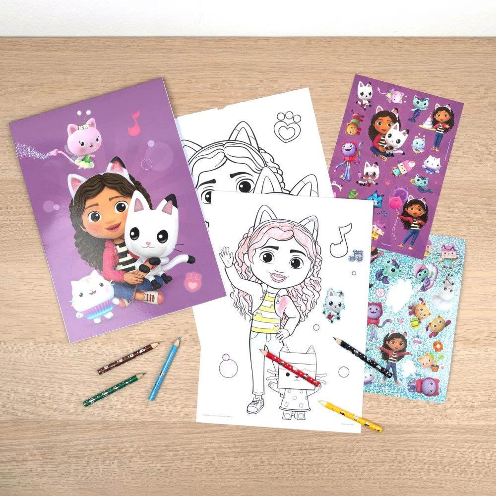 Ten kreatywny zestaw pozwala dziecku zanurzyć się w świecie Gabby's Dollhouse i rozwijać kreatywność. 30 stron do kolorowania z ulubionymi scenami i postaciami pobudzi dziecięcą wyobraźnię. W zestawie znajduje się także sześć kolorowych kredek oraz arkusz naklejek, które pozwolą dzieciom dodać osobisty akcent do ich prac.