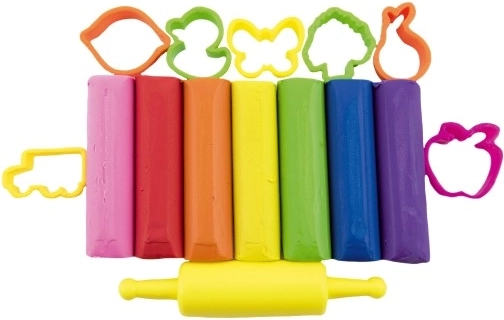 Zestaw zawiera masy plastyczne w różnych kolorach - różowy, czerwony, pomarańczowy, żółty, zielony, niebieski i fioletowy.