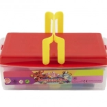 Plastikowe pudełko z czerwonym wieczkiem i żółtą rączką do łatwego przenoszenia i przechowywania mas plastycznych, wykrawaczek i wałka.