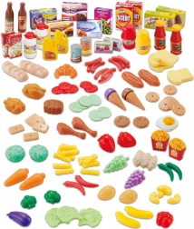 Zestaw zawiera: 120 różnorodnych elementów, w tym owoce, warzywa, pieczywo, przekąski, napoje i opakowania.