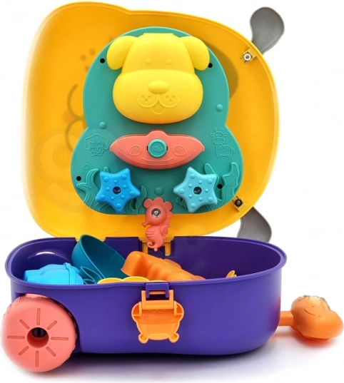 Ten przenośny kuferek zamienia się w małą wodną piaskownicę, która zajmie dzieci w domu, w ogrodzie i na plaży. Dzięki bogatym akcesoriom dzieci mogą tworzyć z piasku, a jednocześnie odkrywać efekty wodne. Zabawka wspiera motorykę małą, kreatywność i percepcję sensoryczną.