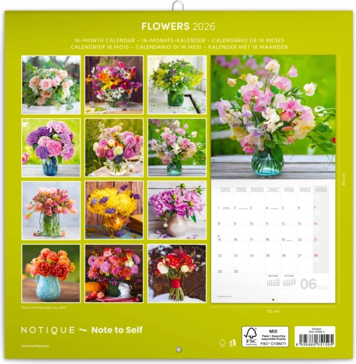 Zafunduj sobie piękno świeżych kwiatów na zdjęciach, które nigdy nie zwiędną, dzięki kalendarzowi notatkowemu na rok 2026. Oferuje przejrzyste kalendarium, ważne święta oraz miejsce na notatki w sześciu językach.