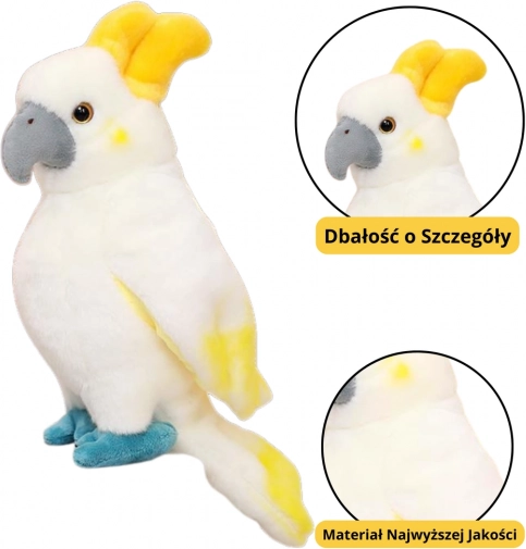 Pluszowa kakadu to pięknie wykonana zabawka o walorach estetycznych i edukacyjnych, idealna jako dekoracja i przytulanka.