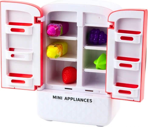 Lodówka-zabawka wyróżnia się innowacyjnymi funkcjami i możliwościami. Zawiera kolorowe owoce, butelki na soki oraz półki do swobodnego rozmieszczenia wewnątrz, co pozwala dzieciom na rozwój kreatywności i naukę organizacji. Idealna do odgrywania realistycznych scenek z codziennego życia.