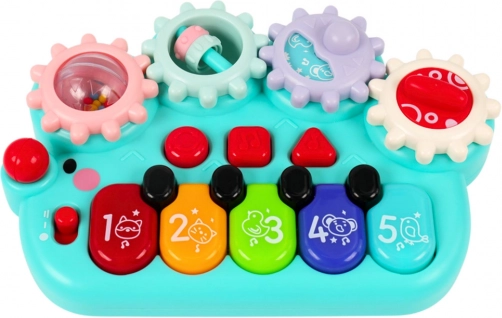 W górnej części pianinka umieszczono obrotowe koła zębate, które dziecko może przekręcać, ćwicząc koordynację ręka-oko oraz małą motorykę. Dzięki kompaktowym wymiarom zabawka idealnie sprawdzi się zarówno do zabawy w domu, jak i w podróży. Wykonana jest z bezpiecznych materiałów i ma przyjemne pastelowe kolory.