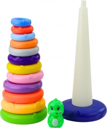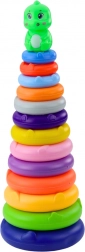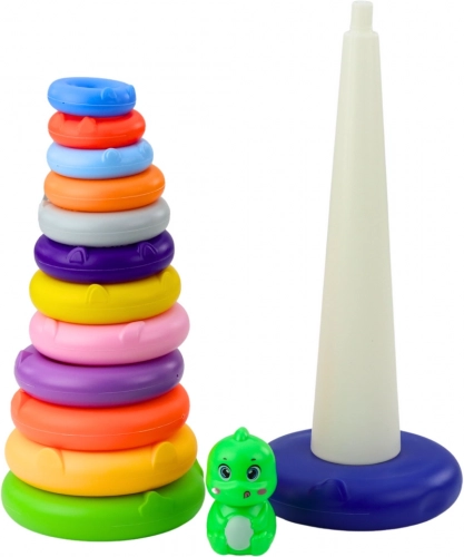 Ta zabawka składa się z solidnej i stabilnej podstawy, wysokiego trzpienia oraz 13 kolorowych krążków o różnych rozmiarach. Wszystkie elementy wykonane są z lekkiego i wytrzymałego plastiku, bezpiecznego dla małych dzieci. Najwyższą część wieży zdobi figurka uroczego dinozaura, która przyciąga uwagę dziecka i zachęca do dalszej zabawy.