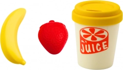 W skład zestawu wchodzą również kolorowe plastikowe owoce: truskawka, banan i limonka, a także kubek na koktajl. Wszystkie elementy są bezpieczne i doskonale pasują do dziecięcych rączek.
