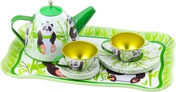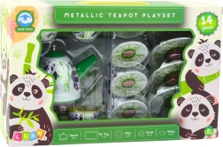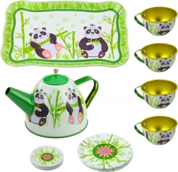 Dziecięcy metalowy zestaw do herbaty z motywem pandy jest idealny dla małych miłośników przyjęć herbacianych. W opakowaniu znajdziesz dzbanuszek do herbaty, cztery filiżanki, spodki i talerzyki. Każdy element jest ozdobiony wesołymi obrazkami pandy i bambusa w zielono-białych kolorach, co zapewnia dzieciom zabawną i kolorową przygodę podczas zabawy.