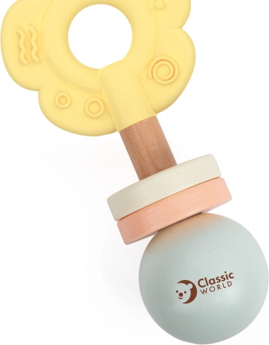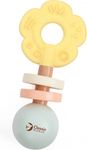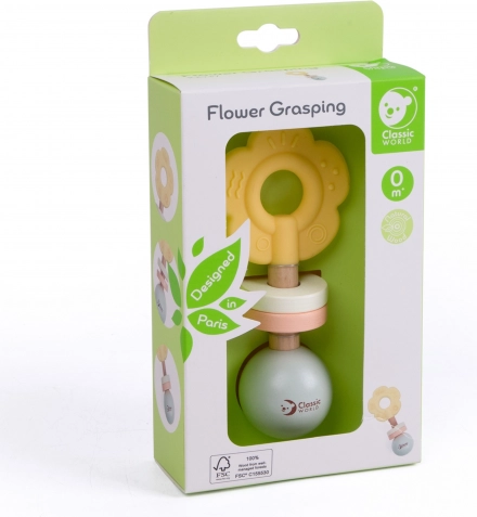Urocza grzechotka w kształcie kwiatka, zaprojektowana dla najmłodszych dzieci, w delikatnych pastelowych kolorach, które przyciągają uwagę malucha. Wykonana z bezpiecznych materiałów: drewna i silikonu, odpowiednia już od urodzenia.