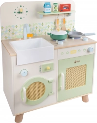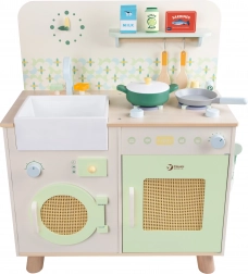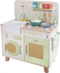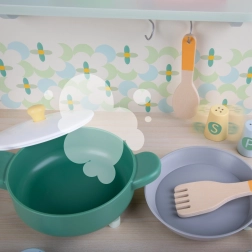 Ta drewniana kuchnia została zaprojektowana dla dzieci od 3 lat i oferuje świetne detale estetyczne w pastelowych barwach. Rozwija wyobraźnię, motorykę i umiejętności społeczne dzieci. Została wykonana z wysoką jakością i dbałością o każdy detal. W zestawie znajdują się także akcesoria kuchenne, które dzieci mogą wykorzystać do zabawy w gotowanie i inne codzienne sytuacje.