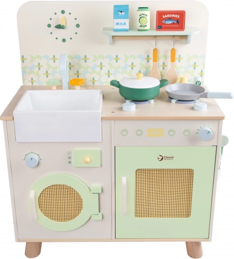 Stylowa drewniana kuchnia Classic World to idealne miejsce na dziecięce kulinarne przygody. Naturalne kolory, realistyczne detale i dodatki sprawiają, że zabawa jest jeszcze bardziej wciągająca, rozwijając kreatywność, samodzielność i zręczność manualną.