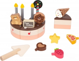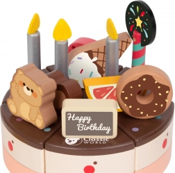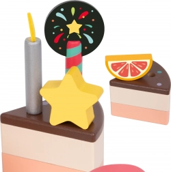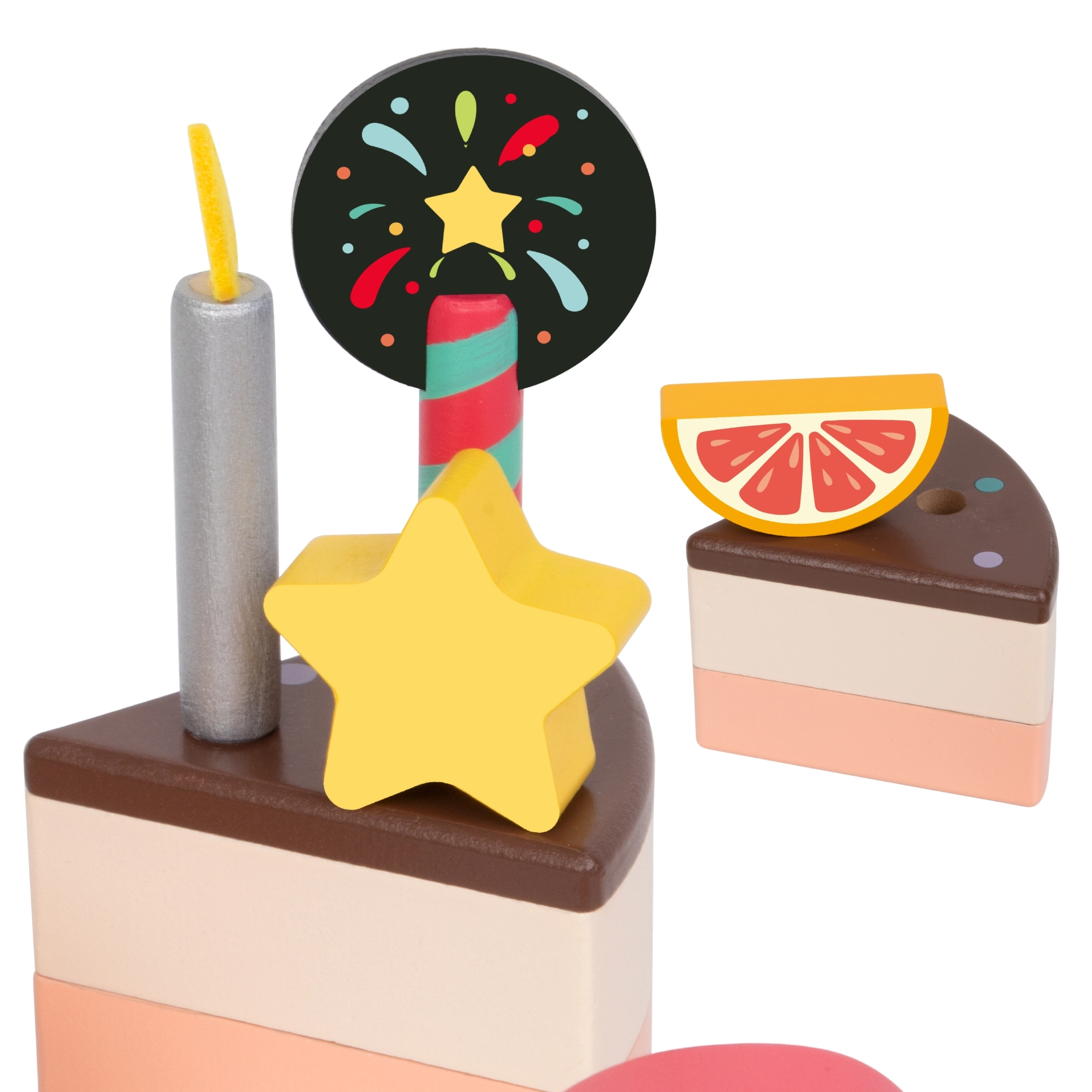 Świętuj każdy dzień z pięknym drewnianym urodzinowym tortem! Dziecko może umieścić świeczki, pomyśleć życzenie i „zdmuchnąć” płomień, tworząc wyjątkowe urodzinowe przyjęcie.