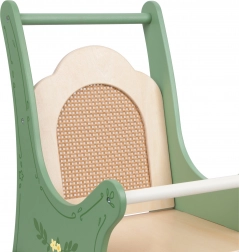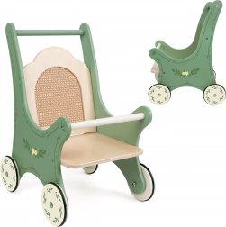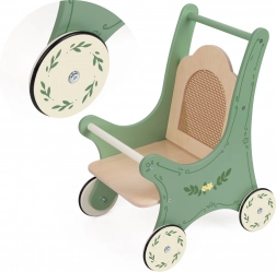Drewniany wózek dla lalek - styl vintage z rattanowym oparciem! Ciesz się unikalną retro atmosferą dzięki zielonej konstrukcji z kwiatowymi ornamentami i rattanowym oparciem. Idealna zabawka dla dzieci, które uwielbiają opiekować się swoimi lalkami i pluszakami.