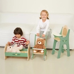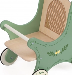 Ten urokliwy wózek dla lalek łączy klasyczny styl z naturalnymi materiałami. Jego zielona konstrukcja z kwiatowymi ornamentami i rattanowym oparciem przyciąga uwagę i tworzy wyjątkowy retro styl. Idealny dla małych dzieci, które lubią bawić się w opiekunów.