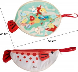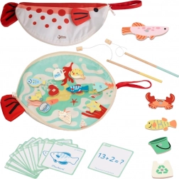 2 magnetyczne wędki, drewniane rybki i przedmioty do łowienia, karty edukacyjne, mata w kształcie ryby / etui