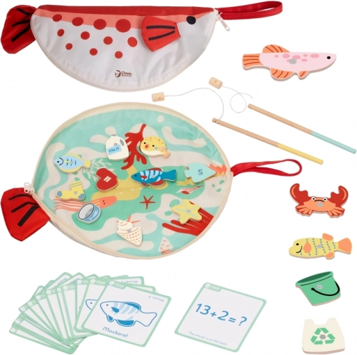 - 2 magnetyczne wędki, drewniane rybki i przedmioty do łowienia, karty edukacyjne, mata w kształcie ryby / etui